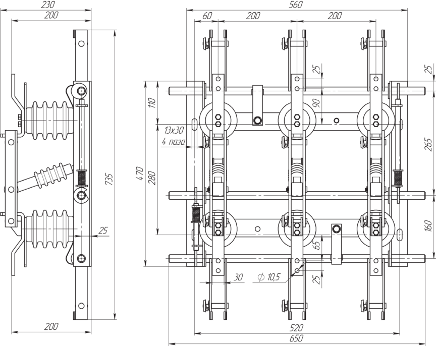 Габаритные размеры, чертеж разъединителя РВЗ-10/630 III УХЛ2